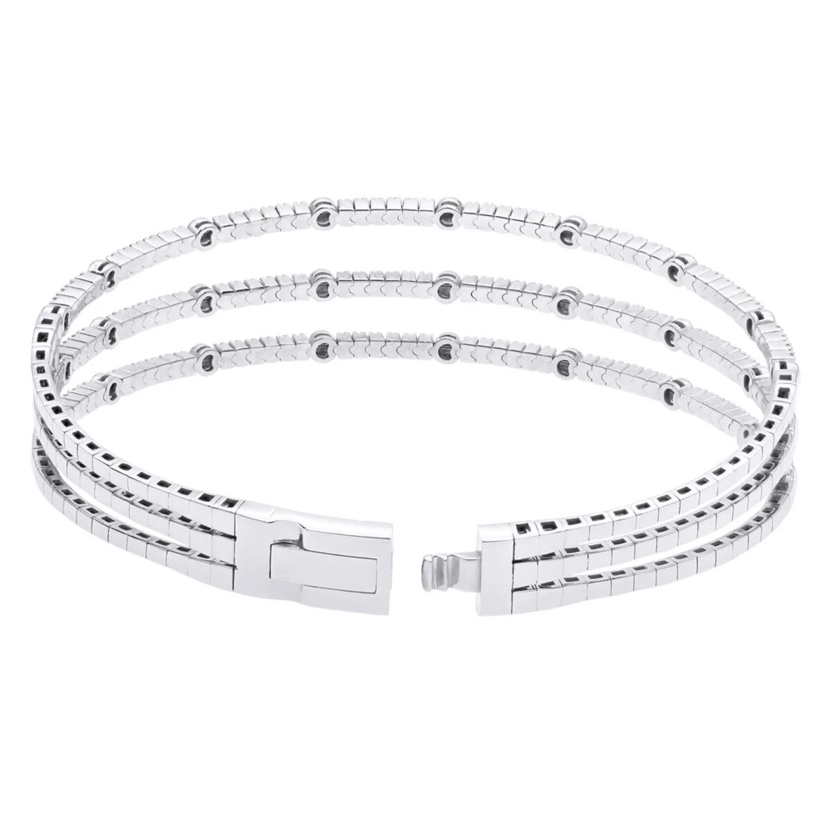 From our ladies diamond bracelets collection This unique 1.5 carat flexible diamond bangle bracelet for women in 14k gold makes a dazzling statement. This unique take on the classic bangle bracelet features an intricate design with 3 beautiful diamond bracelets combined in one. The bracelet’s eye-catching links present numerous prong set white diamonds interchanging with polished golden dots. The bangle weighs approximately 20 grams and is available in 14K white, yellow and rose gold and will be a show stopper in any color.