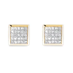 Princess cut diamond stud earrings collection: These 14K Gold Invisible Set Princess Cut Diamond Earrings for Men and Women weigh approximately 5 grams and showcase 1.25 carats of sparkling princess cut diamonds, each expertly set in invisible setting with highly polished gold frames to make it look like a one large princess cut diamond. Featuring a popular square kite shape and screw back closures for secure wear on pierced ears, these real diamond stud earrings are available in 14K white, yellow and rose gold to accommodate your style.
