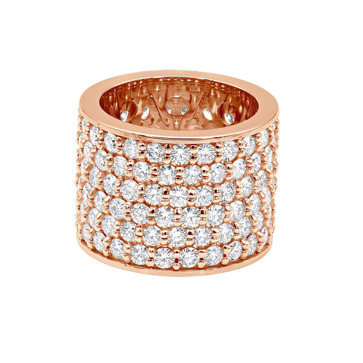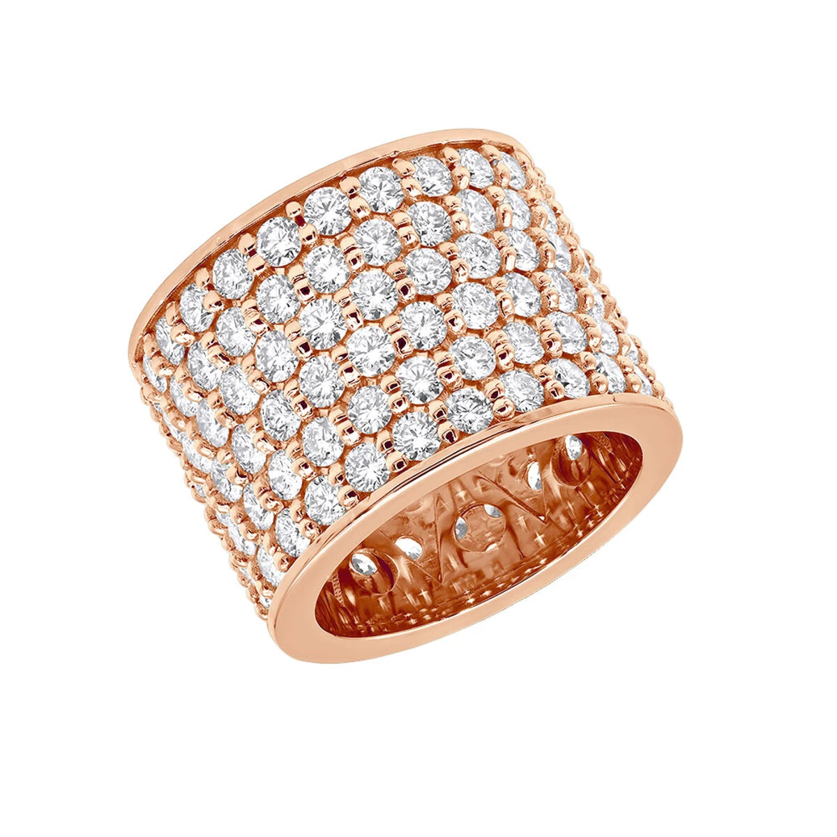 From our diamond eternity bands and ladies diamond anniversary rings collection: This stunning Unique 18K Gold Diamond Eternity Band for Women showcases the dazzling charm of 7 carats of naturally mined round cut diamonds pave set into 6 full circles creating a striking and unforgettable 16mm (11/16in.) band. The highly polished 18K gold band presents sparkling VS-SI quality diamonds weighing 7 carats. Elegantly wrapping the finger, this band possesses endless brilliance and can be worn as an anniversary ring, cocktail ring, right hand ring or a very special wedding band. Choose this fantastic band crafted from the finest 18K white, yellow or rose gold. It will astound everyone with its quality and definitely leave a long lasting impression!