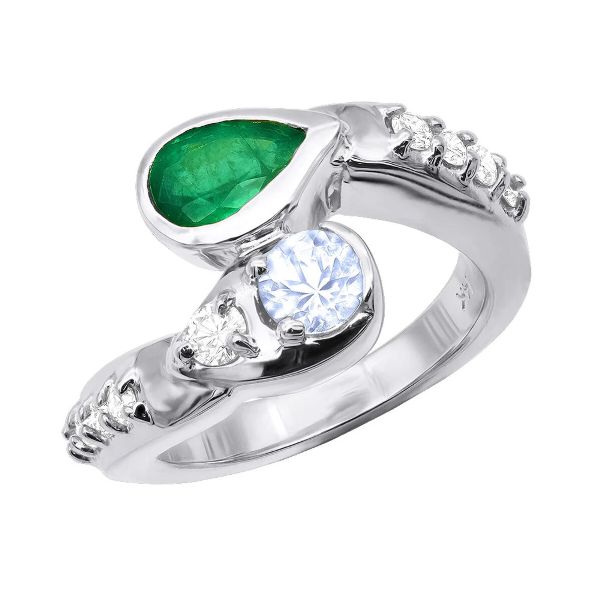 New in our Custom Jewelry Collection: This Diamond Emerald and Aquamarine Cocktail Ring for Women in 14K Gold will catch anyone’s eye. With precious and semi-precious stones glittering seductively against the intricate double edged highly polished band, it is an undeniably tasteful idea for a special present. Bold and timeless, this ring features a stunning and sophisticated combination of 0.35 carats of white round diamonds, 1/2 carat blue round aquamarine and a 3/4 carat pear-shaped green emerald. This unique ladies ring is available in 14K white, yellow or rose gold and will be a show stopper in any color.