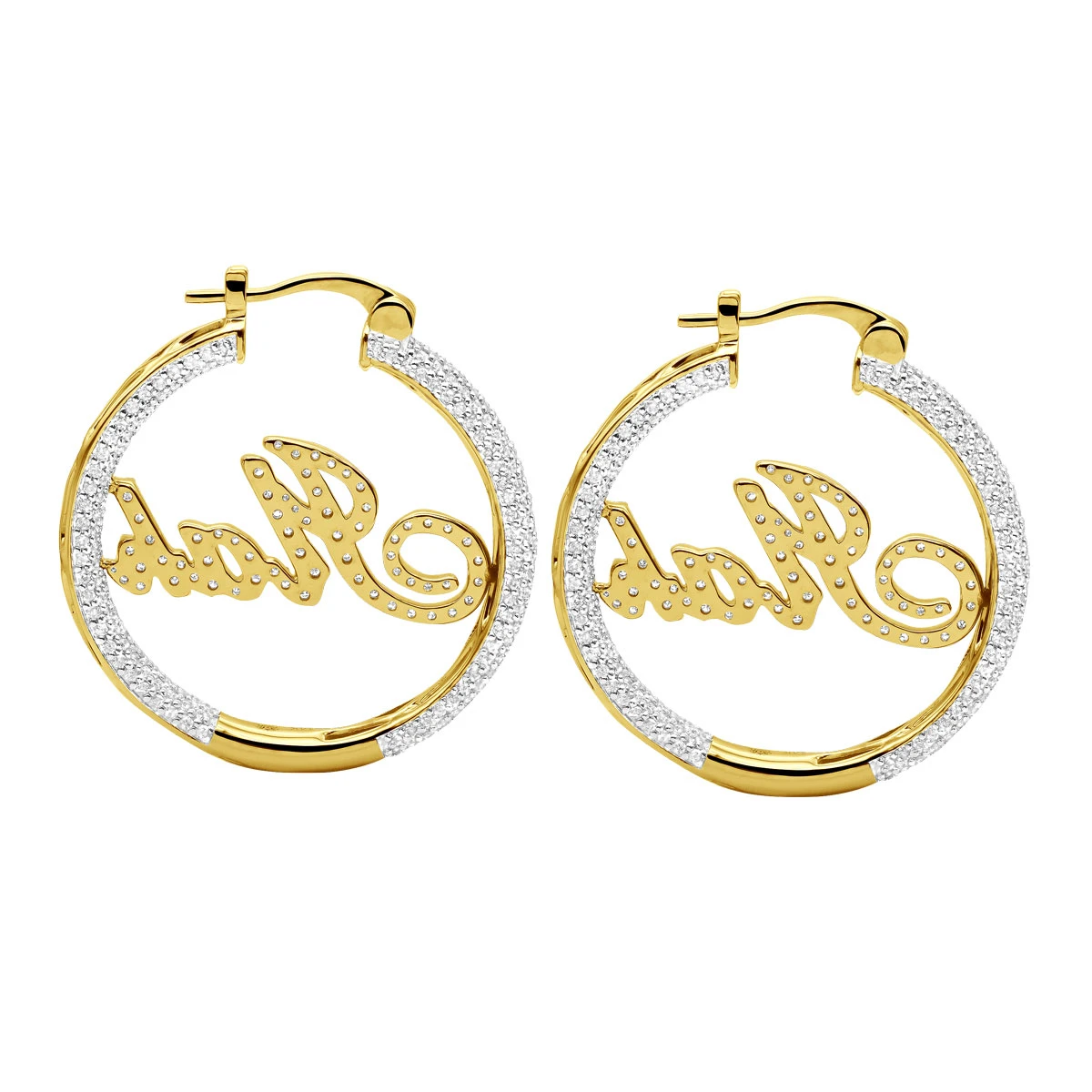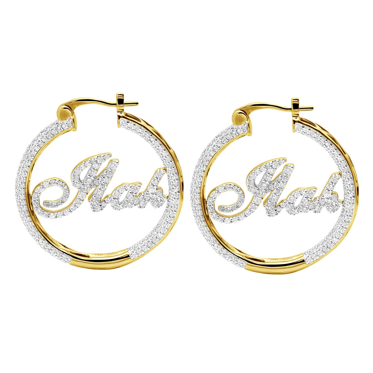 Custom Inside Out Diamond Hoop Earrings With Initials Nameplate 14K Yellow Gold