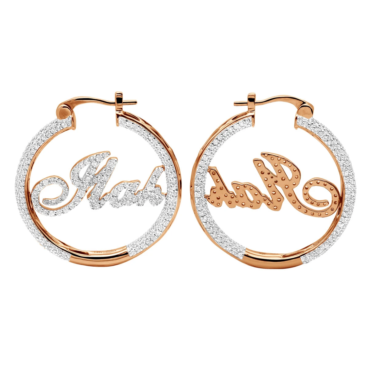 These custom inside out diamond hoop earrings with initials are made in 14k gold and feature a nameplate inside the earrings, the earrings are about 1 1/4in (29mm) long and feature 2.9 carats of genuine diamonds. These diamond hoop earrings are available in 14k white gold, yellow gold, rose gold, as well as 18k gold and Platinum. Contact us to customize them to your specification and your own initials or name plate! Please note: current manufacturing time is 2-3 weeks, so please plan accordingly.
