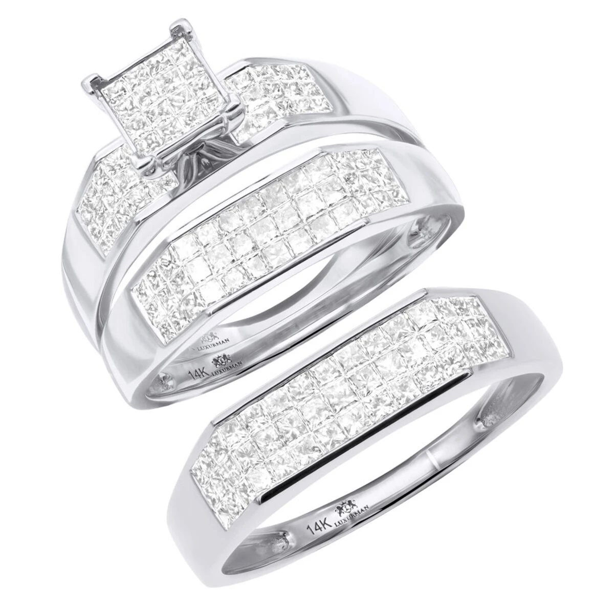 This Princess Cut Diamond Trio Set in 14K gold showcases 2.53 carats of invisibly-set princess cut diamonds. Featuring a luxurious design and a highly polished gold finish, this fabulous ring set consists of a pre-set diamond engagement ring and 2 matching diamond wedding bands (1 for him and 1 for her), and is available in 14K white, yellow and rose gold.